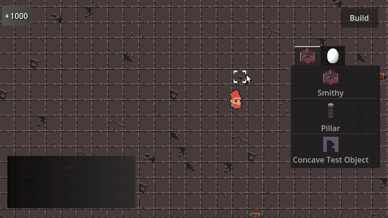 - Building System - When set with a placeable resource, triggers a preview mode where you can see where your new scene objects can be placed onto. Uses GridTileIndicators to show collisions for each individual tilemap space. After calling the build action in game, attempts to place a copy of your preview object into the game world. To validate this, the system uses build rules to check each requirement for placing the scene object into the game world.